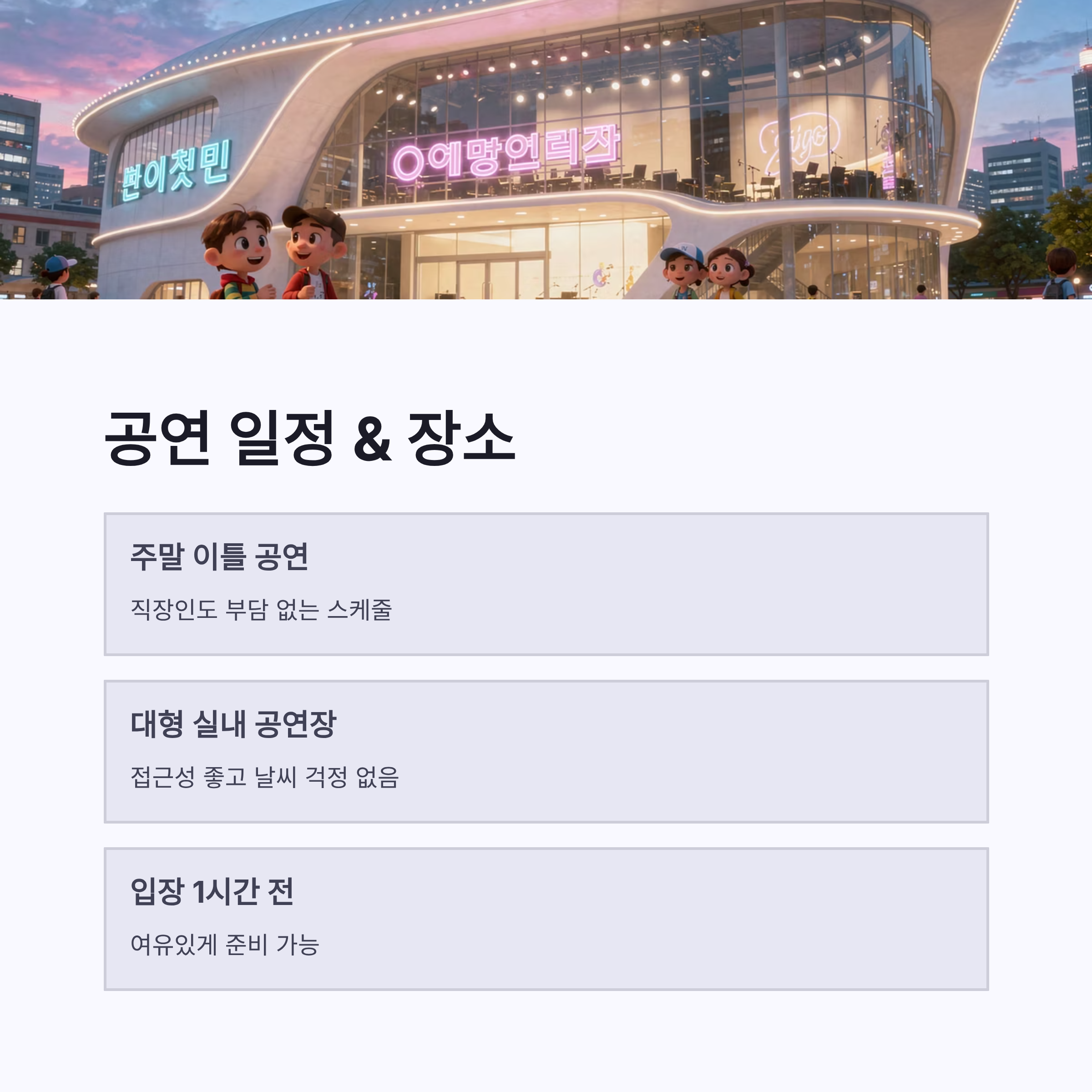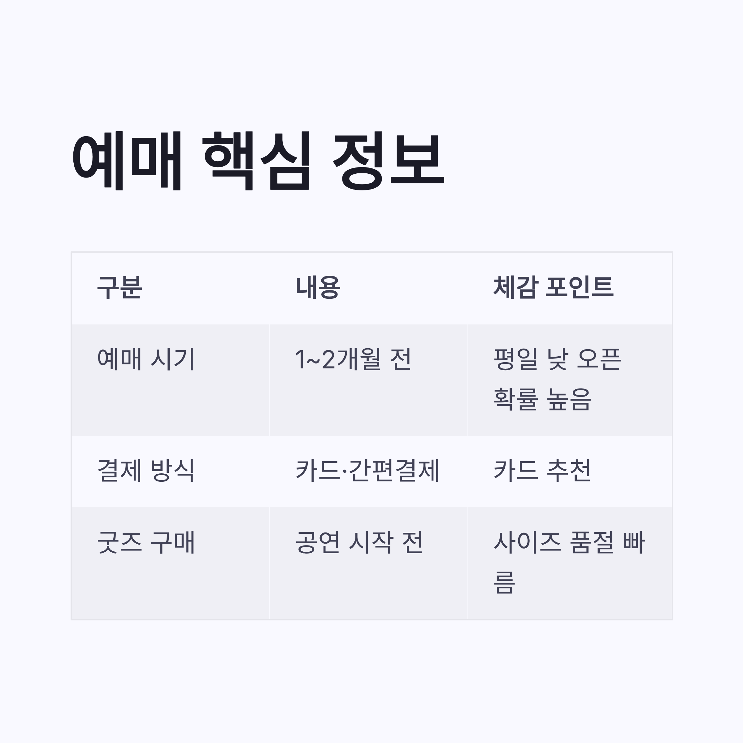 | 예매 시기 | 공연 약 1~2개월 전 | 평일 낮 오픈 확률 높음 |