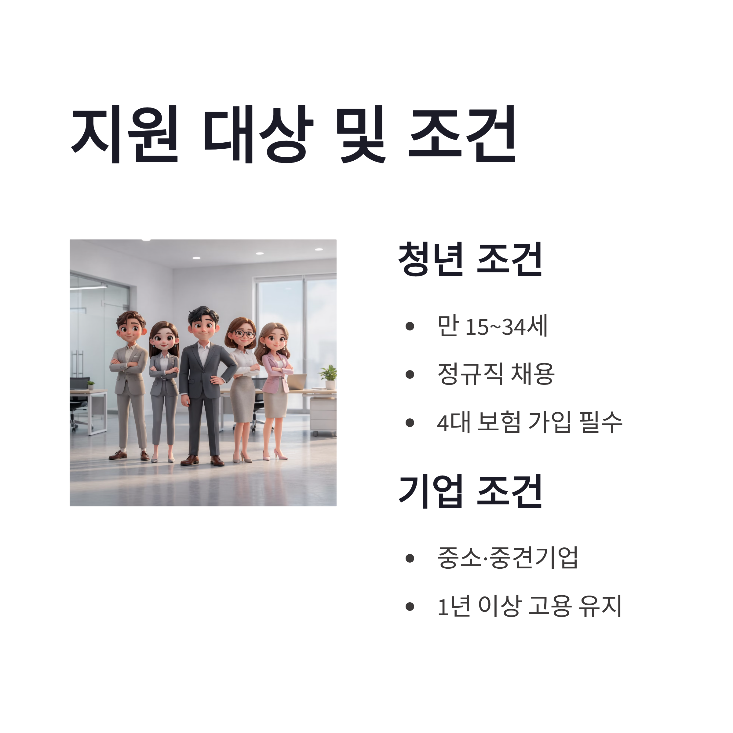 | 청년 조건 | 만 15~34세 | 정규직 채용 | 4대 보험 필수 |