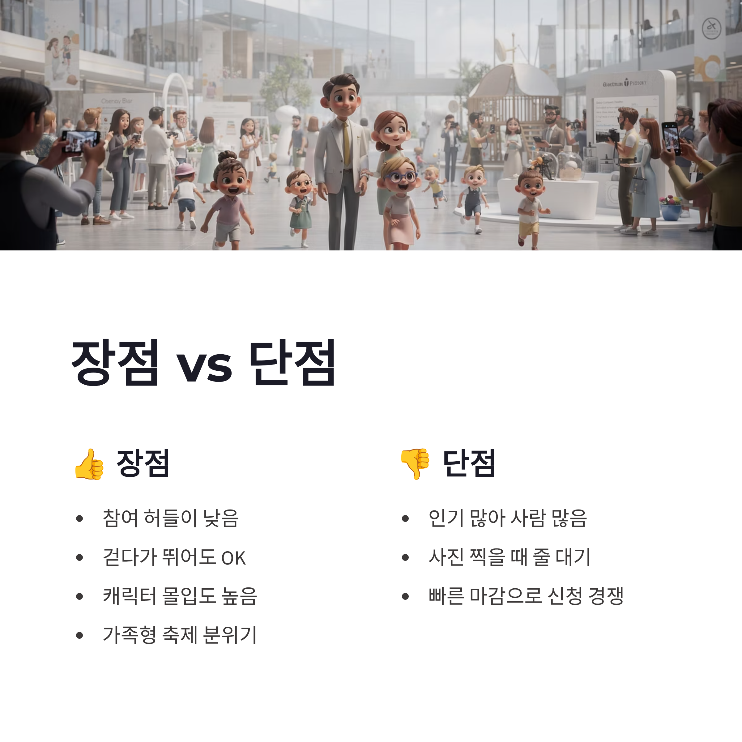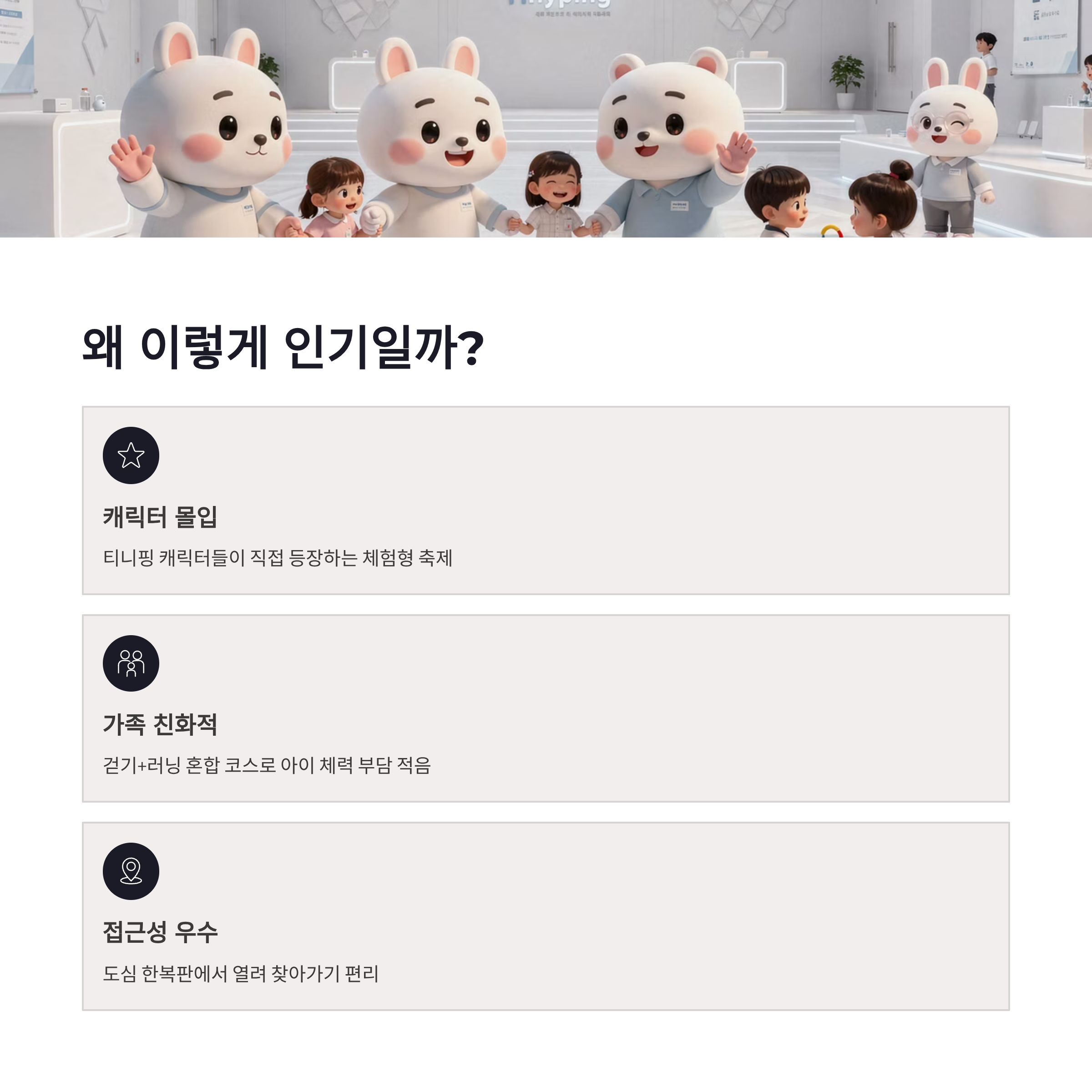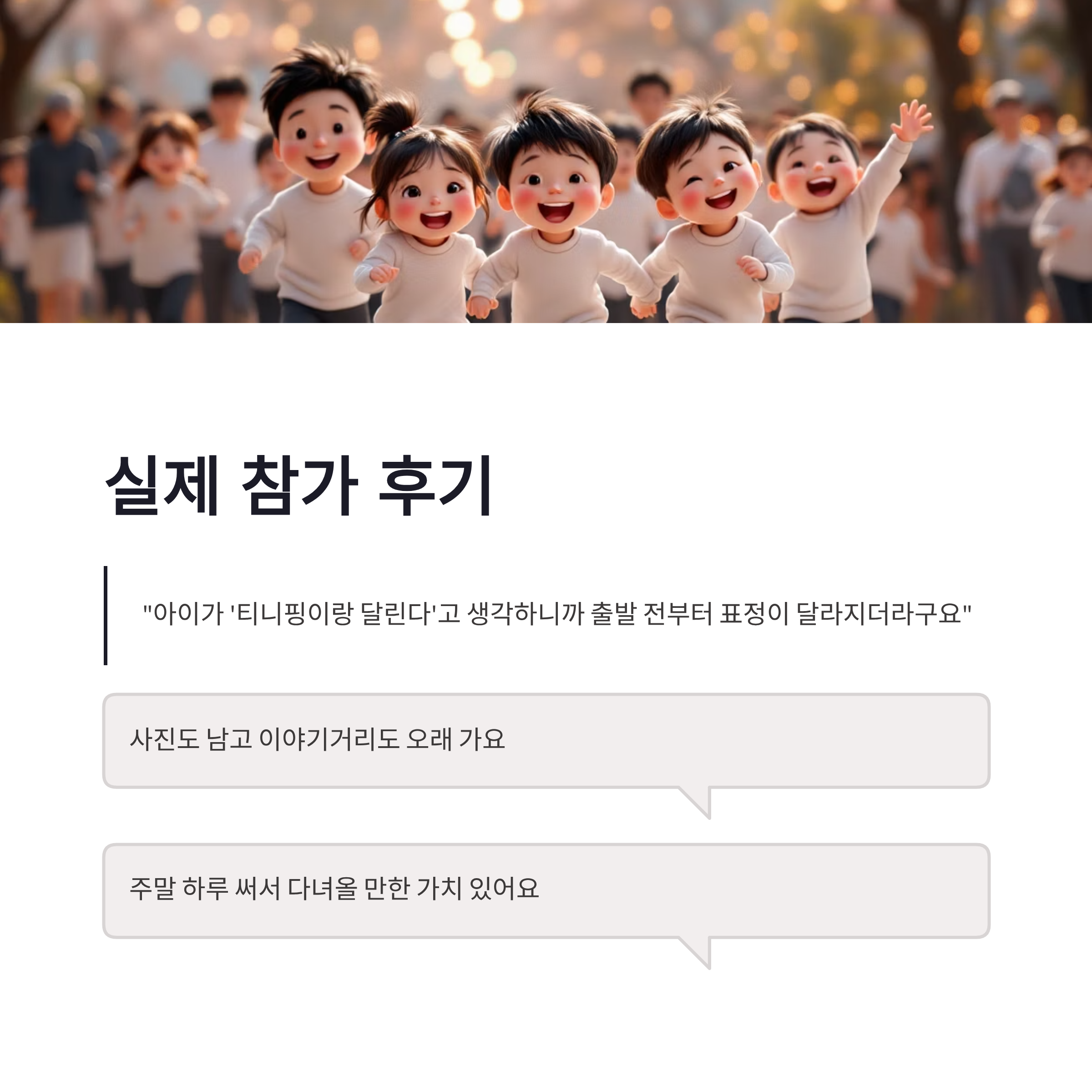 요즘 어린이 러닝 행사가 많아졌는데, 2026 휠라 키즈 티니핑런이 눈에 띄는 이유는 명확해요. 캐릭터 몰입도가 높다는 점! 아이가 “티니핑이랑 달린다”고 생각하니까 출발 전부터 표정이 달라지더라구요. 장점은 참여 허들이 낮고, 걷다가 뛰어도 전혀 눈치 안 보인다는 점이에요. 단점이라면… 인기 많은 만큼 사람 진짜 많습니다. 사진 찍을 때 줄 서야 하는 건 감안해야 해요. 그래도 전체적으로는 가족형 러닝 축제로는 꽤 완성도 높은 편이었어요.