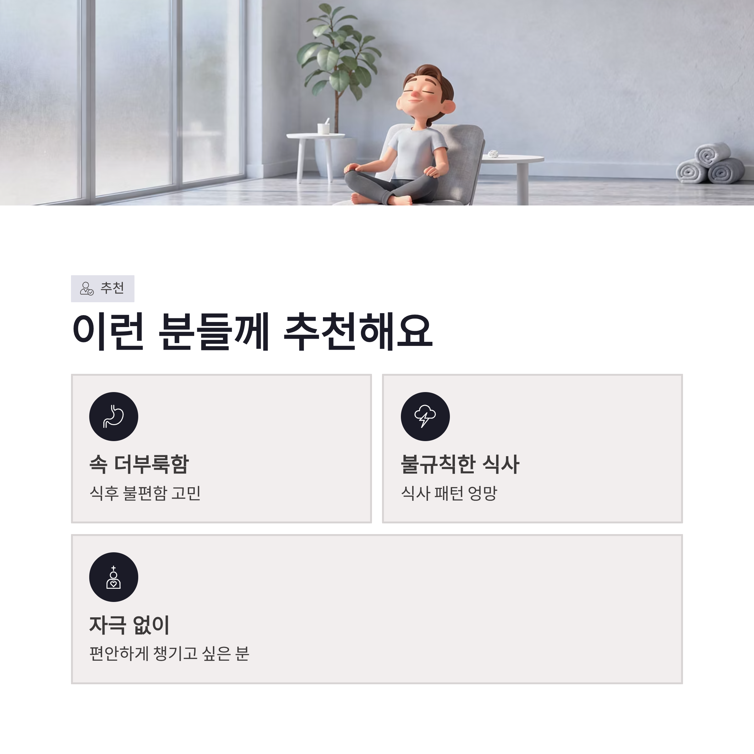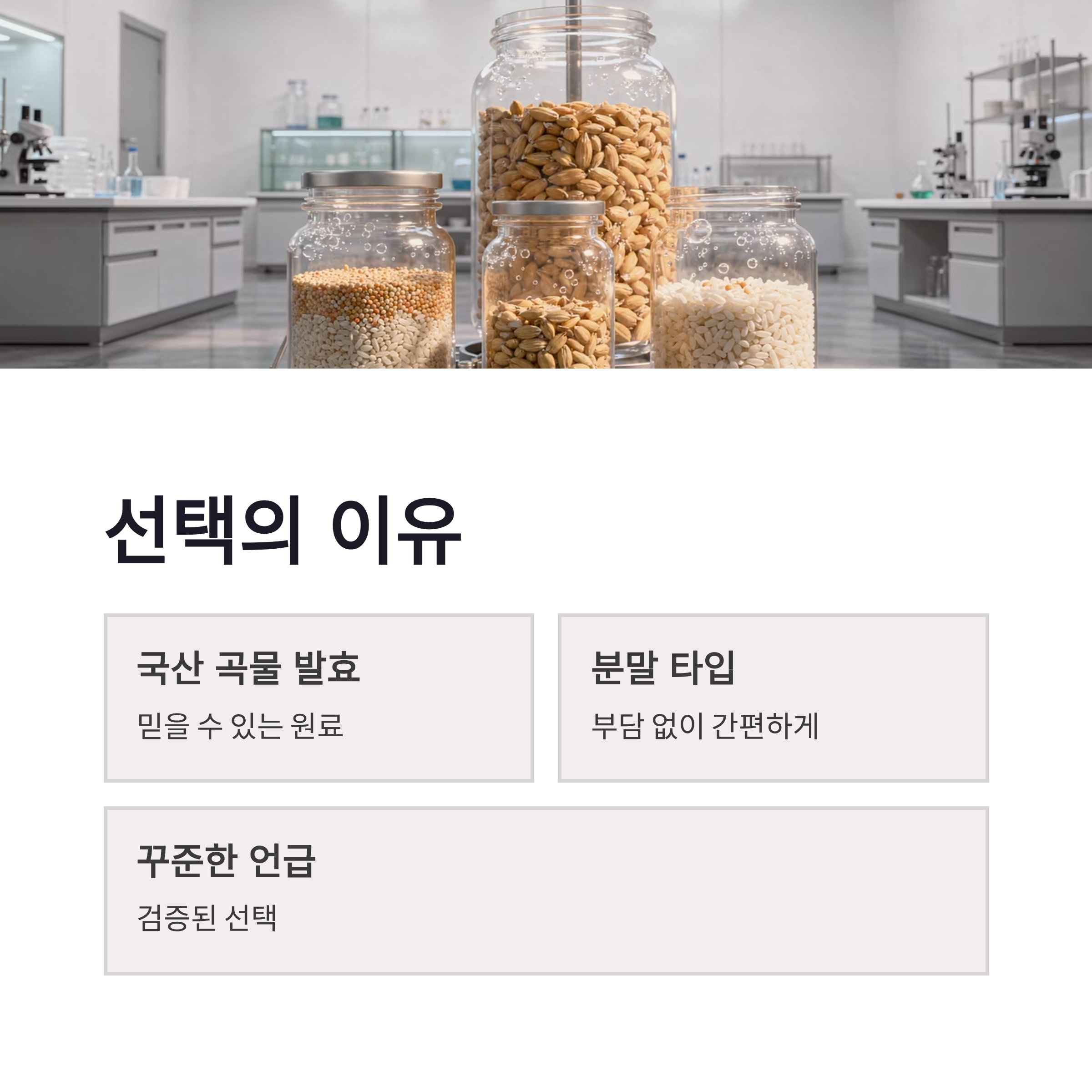 | 구분 | 내용 | | -- | ------------ | | 형태 | 분말 스틱형 | | 구성 | 100포 대용량 | | 원료 | 국산 곡물 발효 | | 섭취 | 물과 함께 또는 그대로 | | 체감 | 식후 더부룩함 완화 |